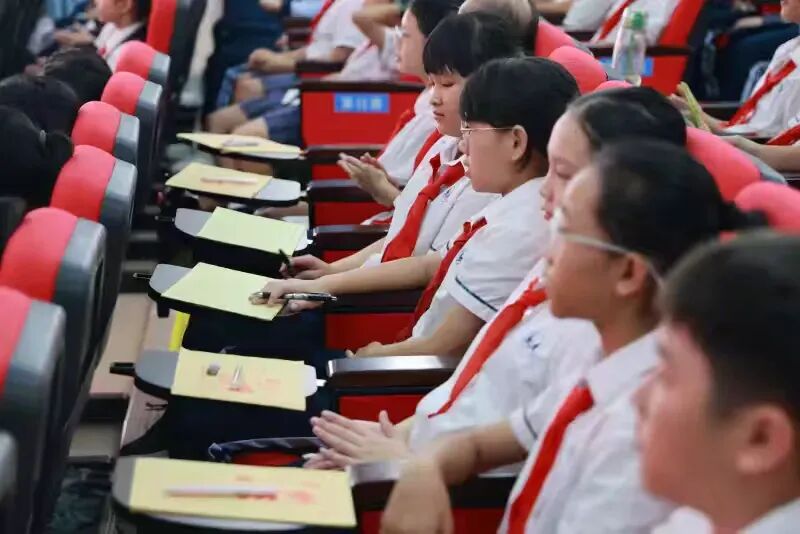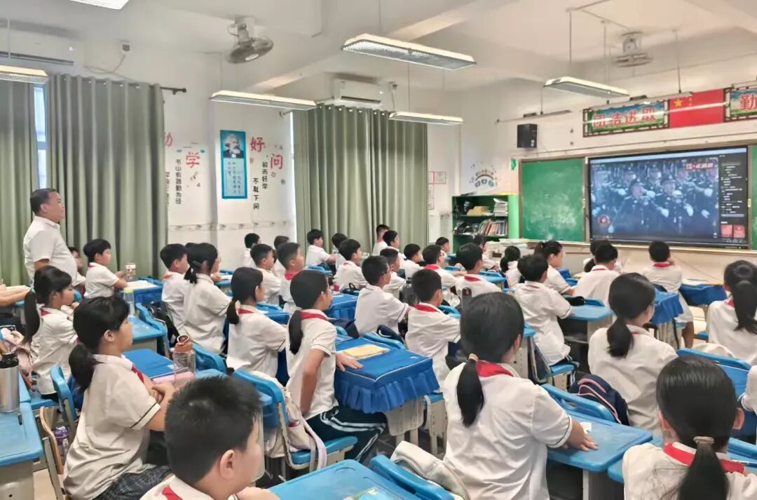 一至五年级的教室里,屏幕亮起的瞬间,原本活泼的孩子瞬间沉静,小身板挺得笔直,目光紧紧追随着阅兵场上的每一个画面;在学校的茂行厅内,六年级的学生们那整齐的坐姿、专注的眼神,将仪式感拉满,仿佛与80年前的英雄们隔空相望。