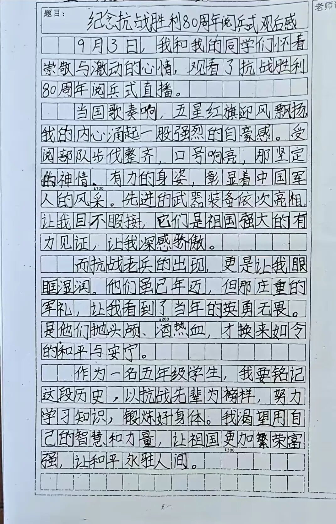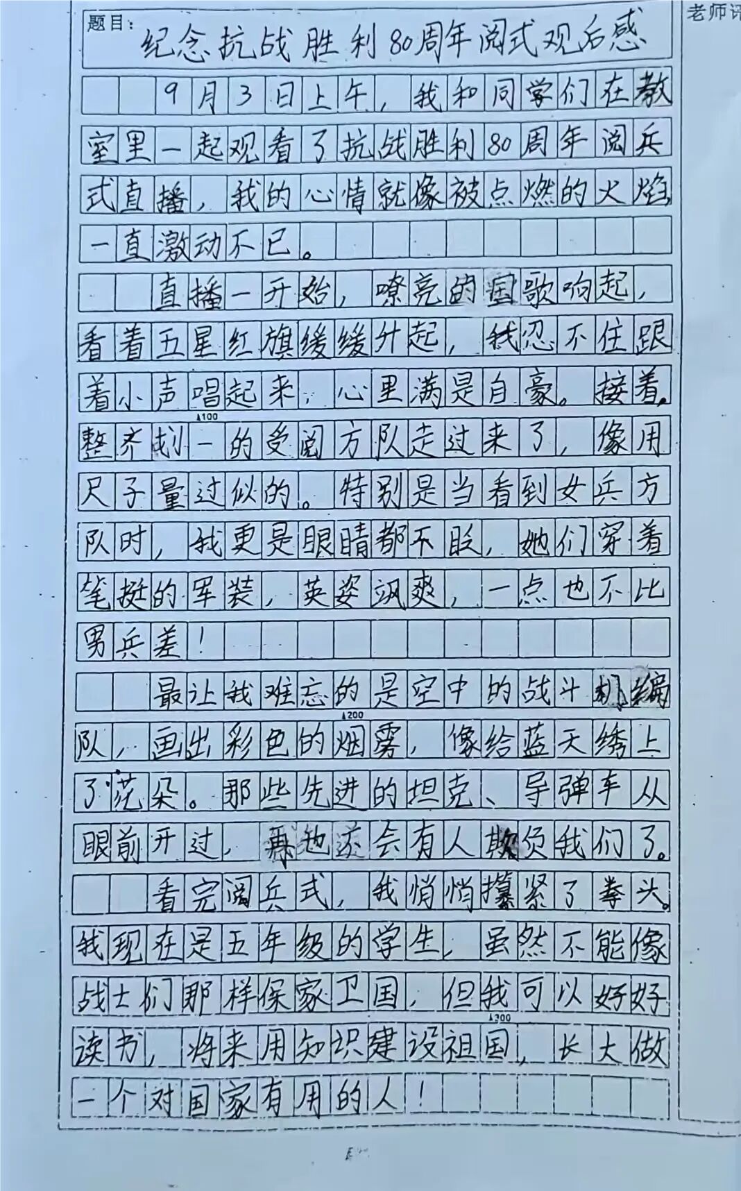 直播结束后,三至六年级的班级里,热烈的讨论如星火般点燃:有孩子激动分享“看到战斗机编队掠过天空时,我的心都跟着飞起来了,那种感觉太震撼啦”;有孩子眼含热泪讲述“抗战老兵敬礼的那一刻,我好像看到了爷爷口中的‘英雄模样’”;还有孩子攥紧拳头说“我以后也要为祖国强大出份力”......班主任们循循善诱,引导孩子们从“阅兵精彩瞬间”谈到“抗战历史新悟”,再到“个人爱国情怀”,最后将满腔热忱落于笔端,一篇篇观后感成了最真挚的成长宣言。