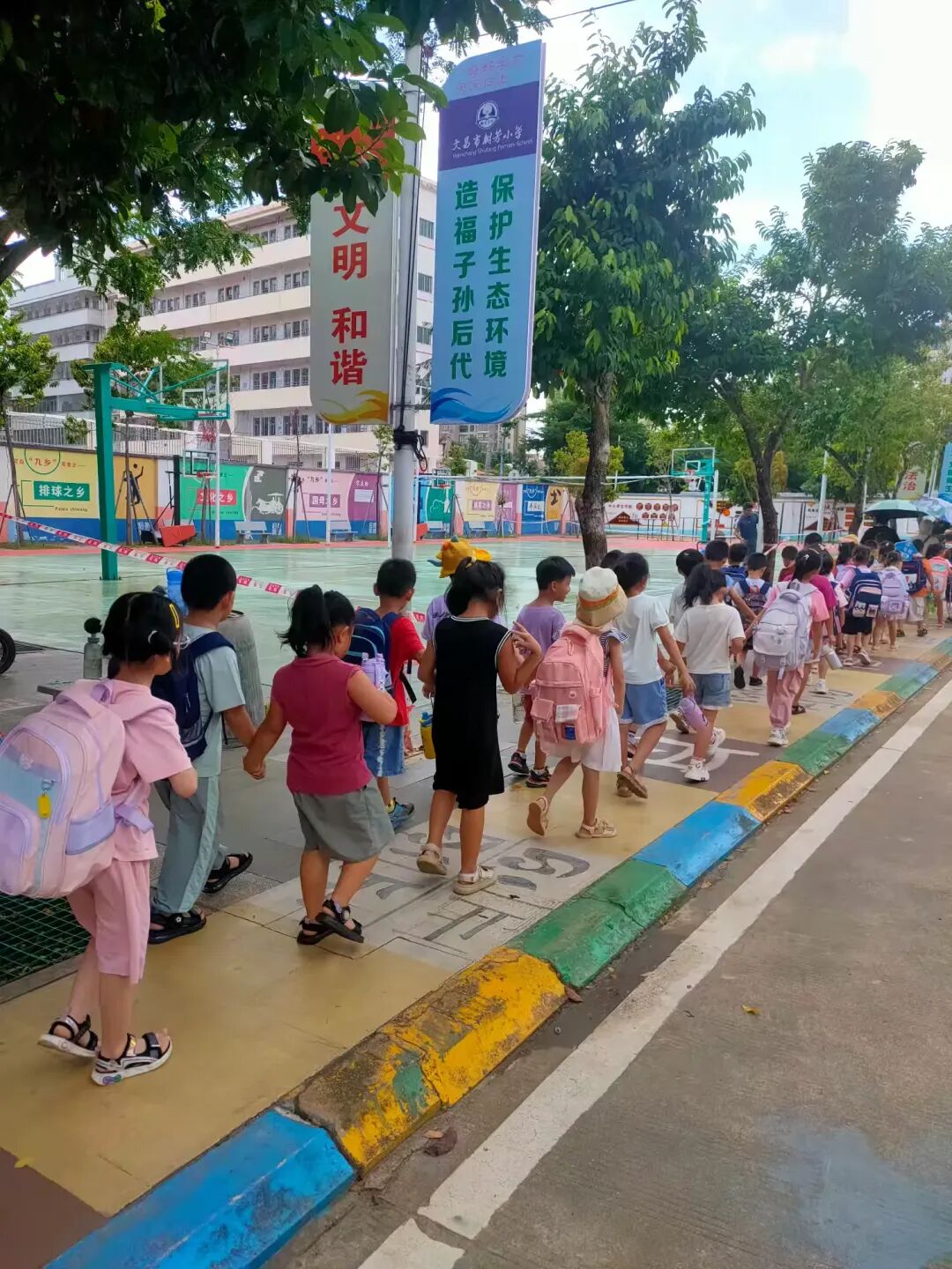 整理好书包后,孩子们排着队走出教室。在教学楼前,他们扬起小脸向老师和校警挥手道别,和同学笑着说“明天见”。整齐的队列里,是一天学习的满足,和对明天校园生活的期待。