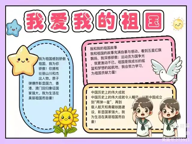 活动要求:请四五六年级的语文老师利用国庆节期间,组织学生进行“礼赞祖国”手抄报创作活动。纸张尺寸大小为A3纸,注意版面设计合理,图文并茂,突出主题。每个班级择优推荐5幅作品上交德育室。