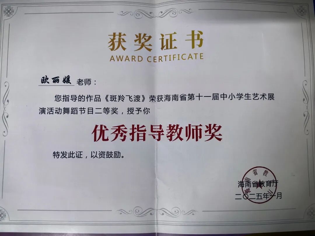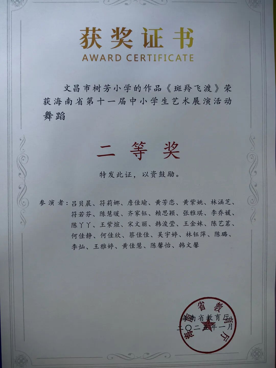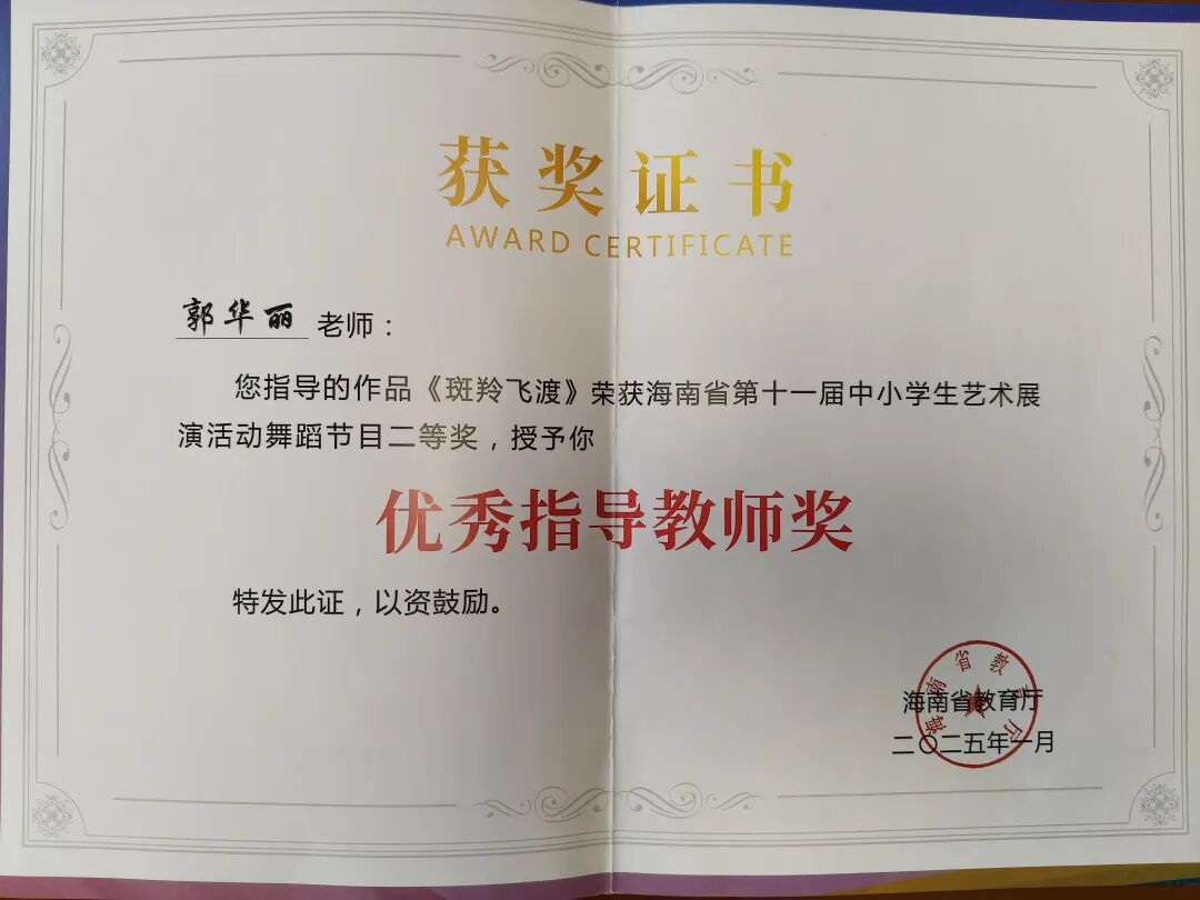 热烈祝贺我校选送的舞蹈《斑羚飞渡》在海南省第十一届中小学生艺术展演活动中,荣获二等奖的优异成绩。欧丽媛、郭华丽老师同获“优秀指导教师奖”!