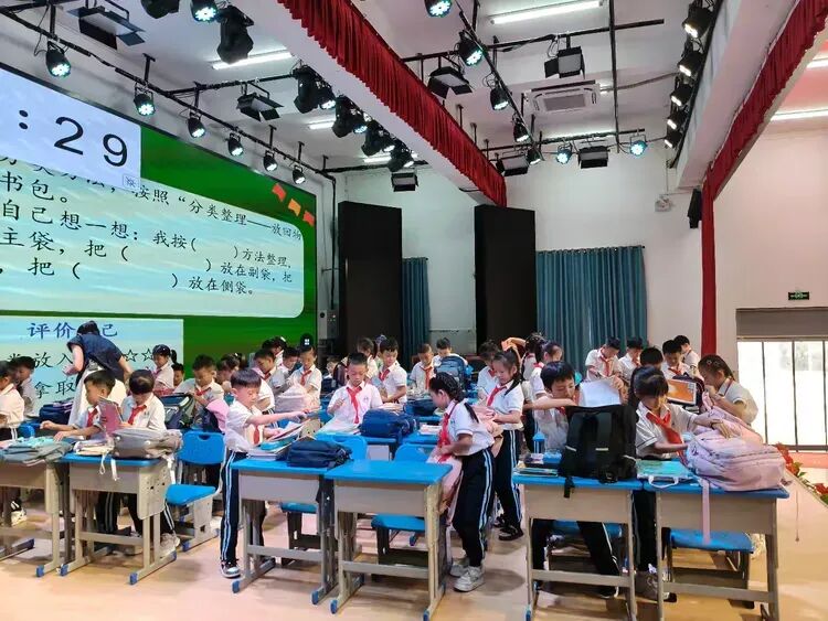 符燕老师以趣味情境点燃学习热情。“哪吒找不到课本啦!”一个有趣的动画导入,瞬间抓住学生注意力。活动环节设计层层递进:先是让学生观察自己的书包,数一数口袋数量、比一比口袋大小,在自主探索中认识书包各口袋的作用;接着以小组为单位,分享书包里的物品,通过对比课本与作业本的大小,思考“如何分类摆放更合理”;最后,学生们动手清空书包,按照规划将物品有序归位,在实践中掌握收纳技巧,不仅让书包变得整齐有序,更培养了条理清晰的思维习惯。