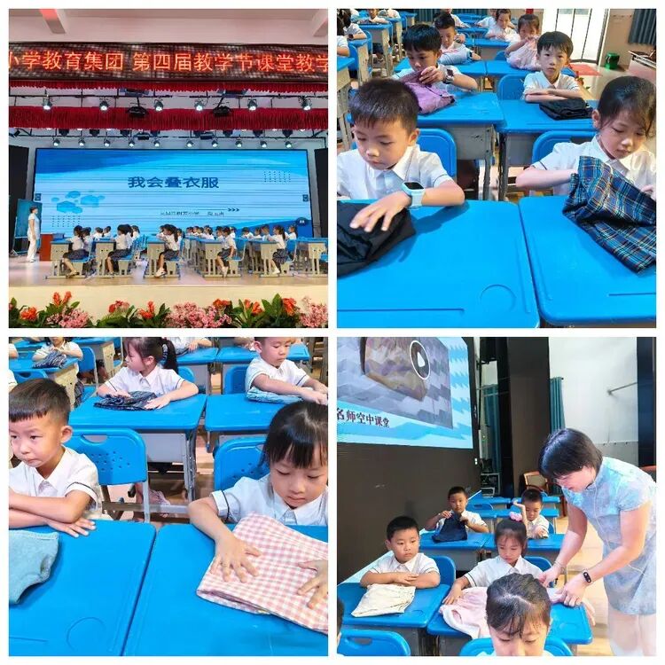 周玉贞老师从生活需求出发,让劳动贴近日常。“晒干的衣服怎么放才整齐?”情境导入直击生活痛点,引发学生共鸣。课堂上,老师通过动画与视频相结合的方式,分步教学叠衣服技巧:先学叠衣服的基础方法,再细化裤子、T恤的专属叠法,直观易懂的演示让学生快速掌握要领。从模仿到实践,从生疏到熟练,学生们亲手将衣物叠得方方正正,最后师生共同回顾课堂内容,巩固所学技能,让“自己的事情自己做”的劳动观念深深扎根。