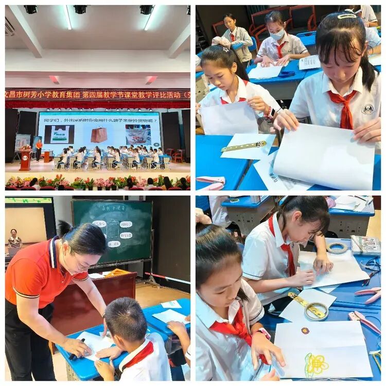 符小燕老师将创意与实操完美融合。课堂伊始,符老师清晰梳理制作步骤,带领学生通过视频直观了解打孔器的使用方法,再完整观看手提袋制作流程,为实践打下坚实基础。随后,学生们化身“小小设计师”,专注地裁剪、折叠、打孔、组装,一个个独具个性的手提袋在手中逐渐成型。制作完成后,大家对照自评表认真互评,用小星星为彼此的作品点赞;面对制作中遇到的问题,师生共同分析原因、寻找对策,更深入探讨“如何让纸袋更牢固”,将思考延伸至课后作业,让劳动技能在持续探究中不断提升。