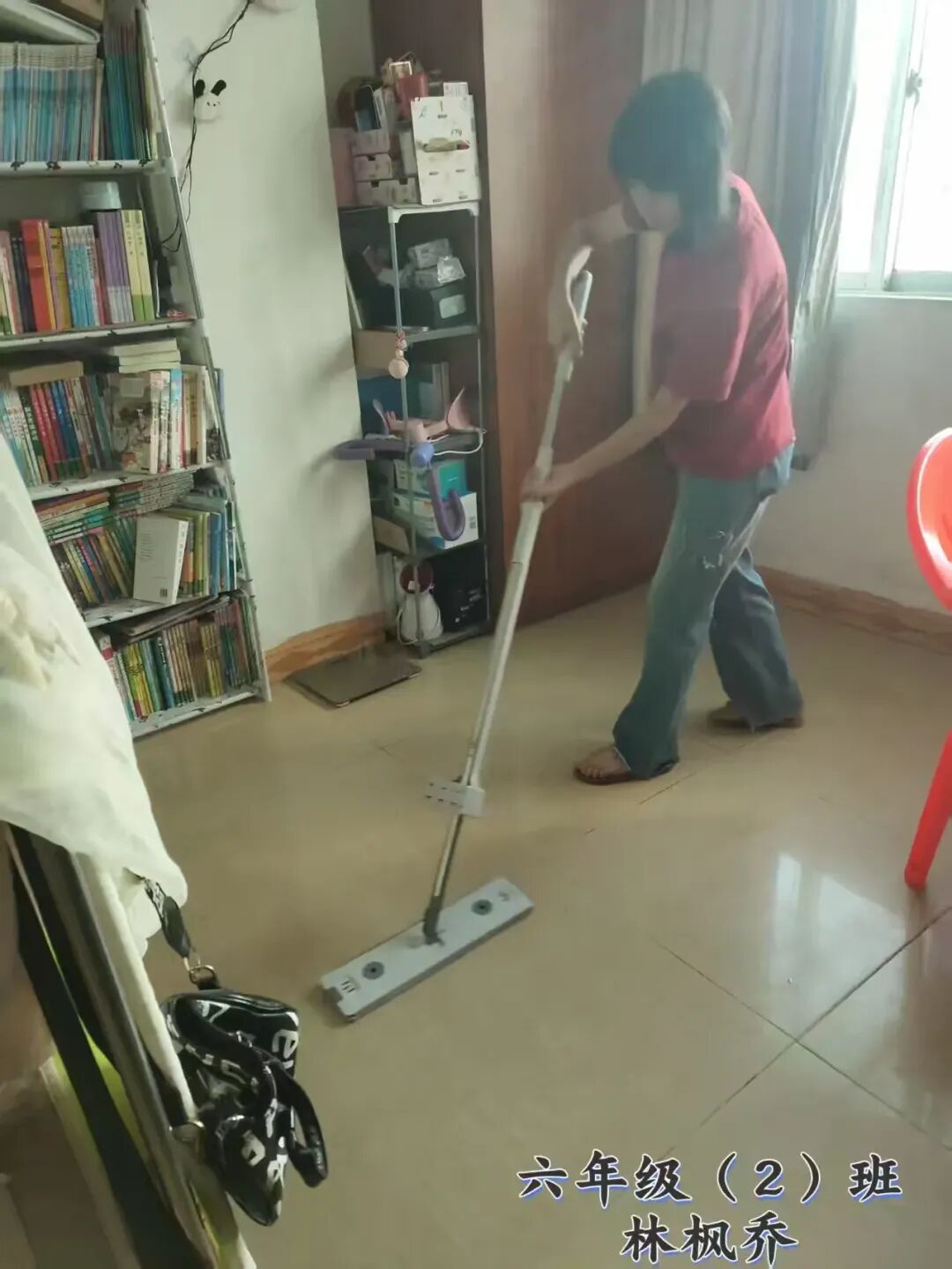 六年级的同学们以拖地板、整理书架、炒菜三项劳动展现了大哥哥大姐姐的担当。拖地板时,他们细致地清洁每一块区域,让家里的地面一尘不染;整理书架时,将书籍按类别摆放,打造出充满书香的阅读角落;炒菜时,从食材处理到火候把控,一道道家常菜在他们手中诞生,用美味回馈家人的付出。这些进阶劳动,让他们在实践中成长为能独当一面的生活小达人!