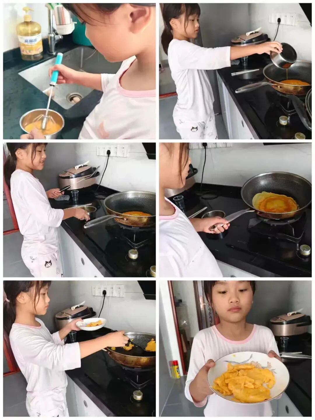 四年级的同学们开启了整理书桌、煎蛋、洗碗筷的劳动之旅。整理书桌时,他们把书籍、文具分类收纳,打造出清爽的学习空间;第一次尝试煎蛋,从磕蛋、倒油到翻面,每一个步骤都充满探索的乐趣,看着自己煎出的金黄蛋饼,成就感满满;洗碗筷时的娴熟动作,更是展现了他们作为家庭一份子的担当。劳动中的探索与实践,让他们对生活技能有了更生动的掌握。