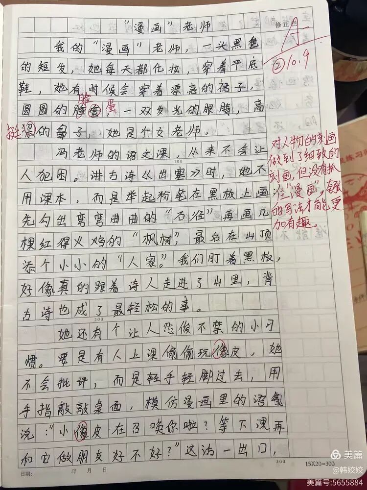 3.批改细致:教师批改认真,有详细的批注和鼓励性评价,如等级,日期等评分标注清晰。
