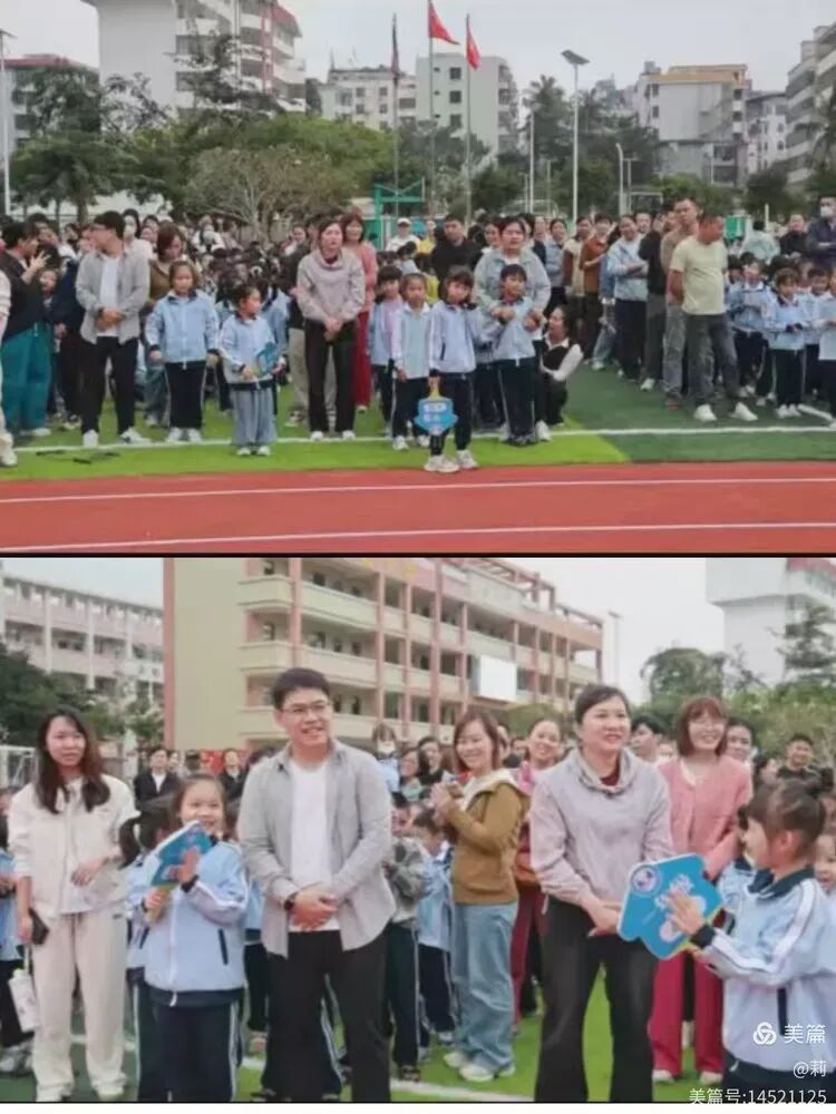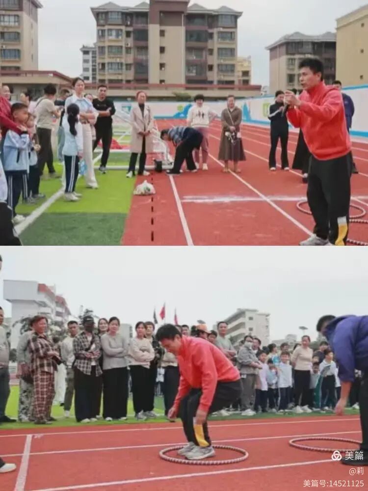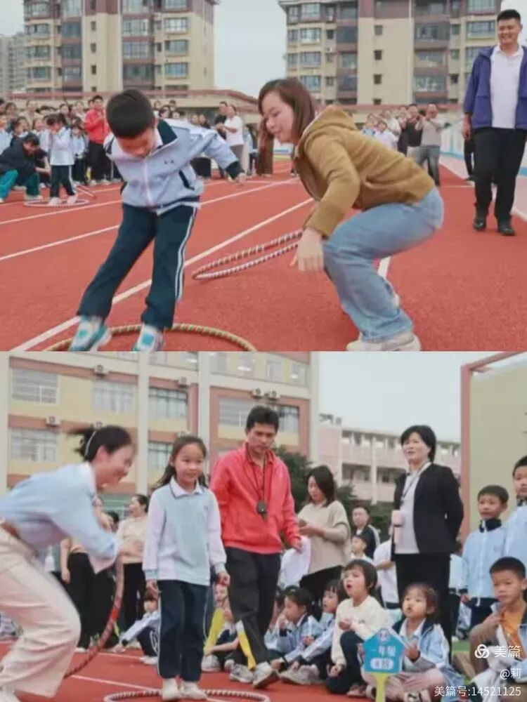 哨声一响,亲子迅速进入状态。孩子双脚灵活一跃,家长默契配合,将呼啦圈稳稳前移。尚未接力到的家长轻声叮嘱孩子注意节奏与落点。体育老师在赛道旁及时提供帮助,看到未能顺利跳出呼啦圈的孩子,主动上前搀扶,助力其完成动作。即便知道本班可能失利,孩子们仍坚持完成全程,展现了不放弃的体育精神。