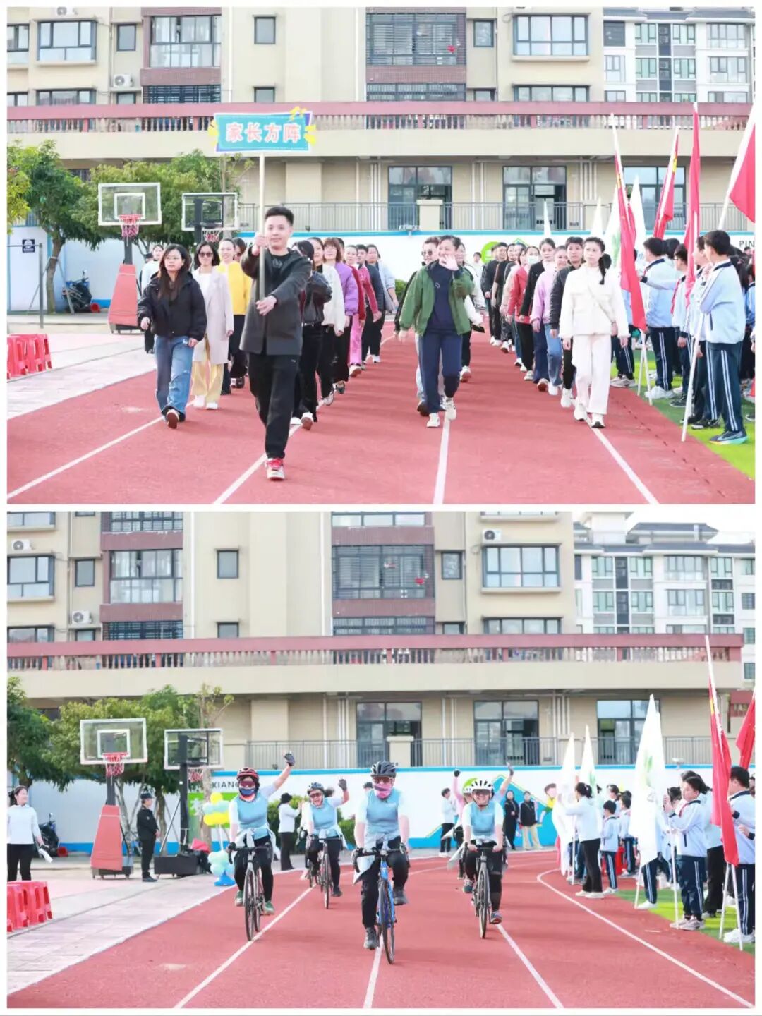 一年级至六年级的班级方阵有序入场。同学们身着统一服装,迈着坚定的步伐,口号响亮、气势如虹,展现出新时代少年的蓬勃朝气;家长代表方阵温情亮相,他们脸上洋溢着对孩子的期许与对学校的支持,成为开幕式上一道温暖的风景线;教师代表骑行方阵压轴登场,老师们骑着自行车缓缓驶过,笑容亲切、活力满满,用独特的方式诠释着“健康运动,快乐同行”的理念,赢得全场阵阵掌声。
