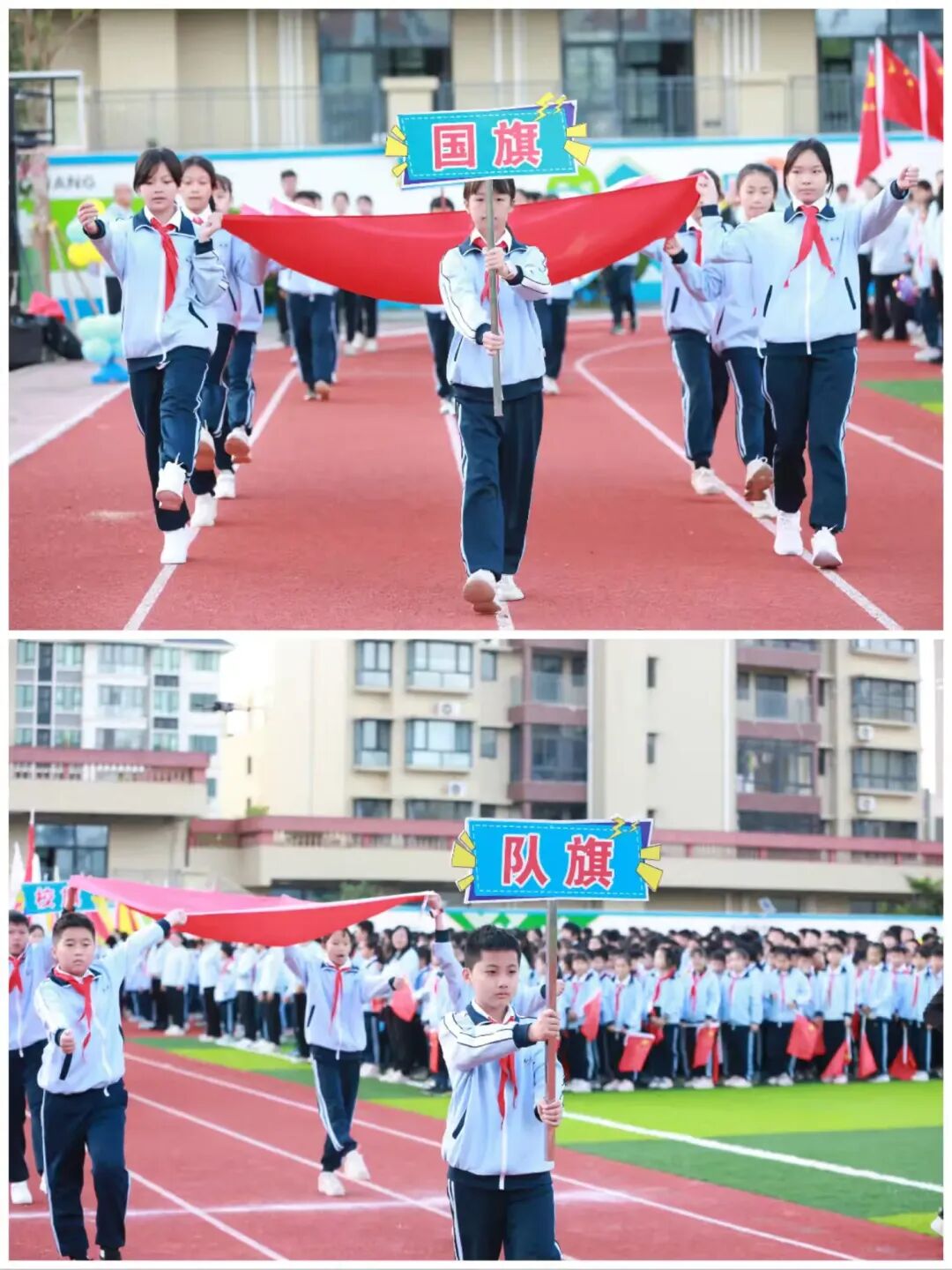 国旗、队旗、校旗、会徽方阵率先登场,鲜红的旗帜迎风招展,象征着责任与荣耀,引领着全体师生奋勇向前;彩旗方阵色彩斑斓,如彩虹绽放,为赛场增添了无限生机;标语方阵的同学们高举牌面,嘹亮的口号回荡校园,彰显着“友谊第一,比赛第二”的体育精神;花环方阵手捧鲜花,笑容明媚,用芬芳与活力传递着对体育节的美好祝福;气球方阵满载希望,五彩气球在手中摇曳,寄托着同学们的梦想与憧憬。