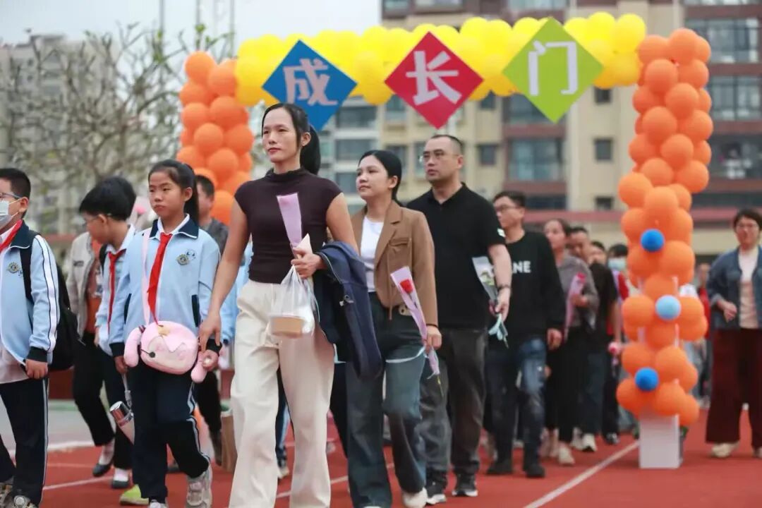 仪式最后,学生们在家长的簇拥下,依次穿过象征蜕变与启航的“成长门”。拱门两侧彩球飞扬,“成长门”三个大字在阳光下闪耀,寓意着孩子们告别稚嫩童年,正式迈入充满希望的少年时代。