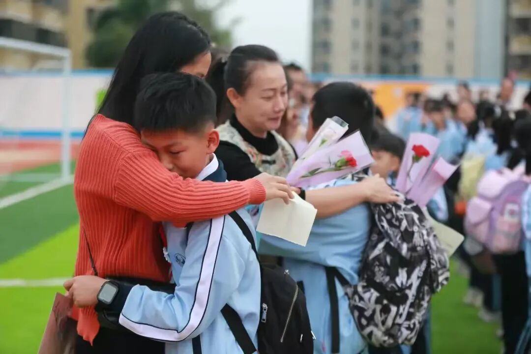 “谁言寸草心,报得三春晖。”在“向父母行感恩礼”环节,孩子们手捧鲜花,将写好的贺卡或书信递到父母手中,深深鞠躬致谢。许多家长眼含热泪,紧紧拥抱自己的孩子,现场温情涌动。