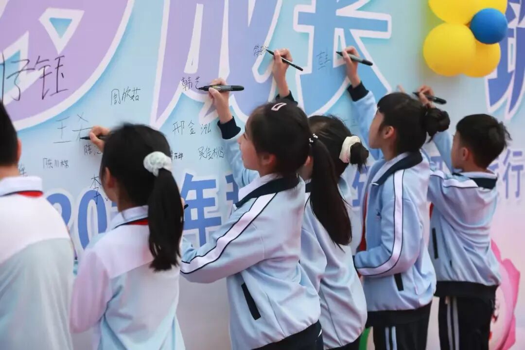 学生们则认真地在大型宣传板上签下自己的名字。签名墙上,“成长礼 十岁成长 筑梦远航”的字样格外醒目,每一笔每一划都凝聚着孩子们对未来的憧憬。