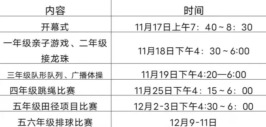 运动会比赛项目、场地和时间安排: