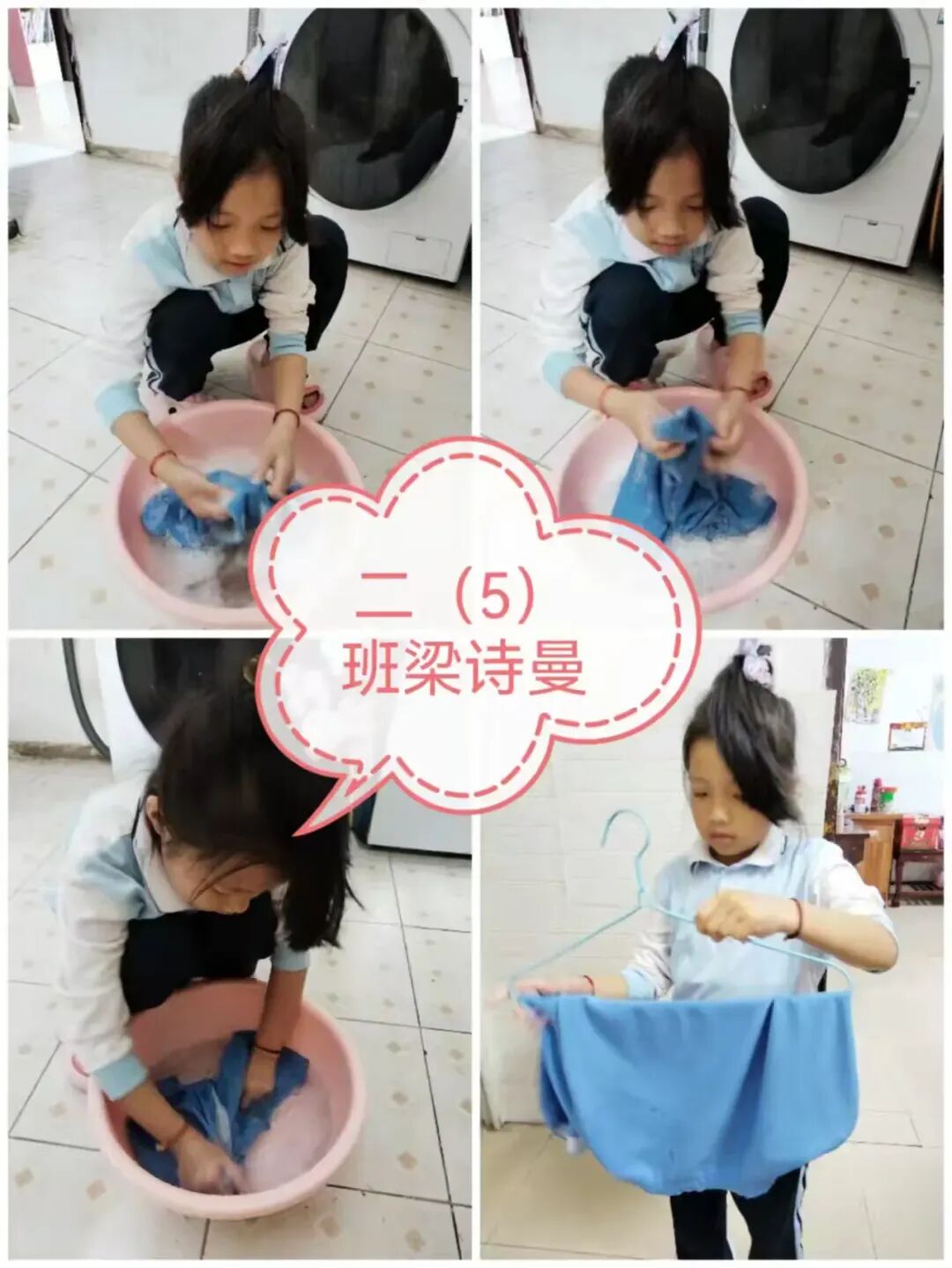 二年级的孩子拿起抹布和水盆,认真清洗桌套,泡沫翻飞间,桌套重新焕发出干净的光彩。