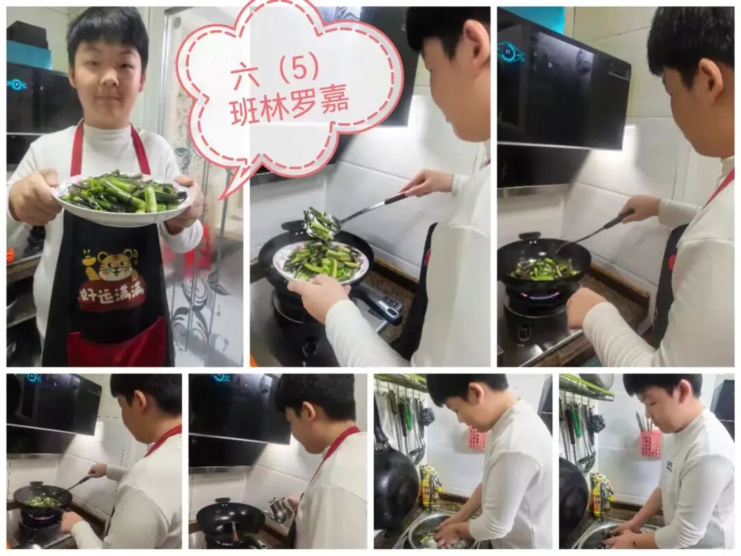 六年级的“小厨师”更是大展身手,切菜、翻炒、调味,一道道色香味俱全的家常菜新鲜出炉,让家人的餐桌多了一份惊喜。