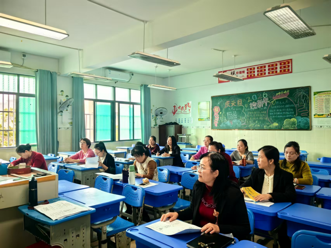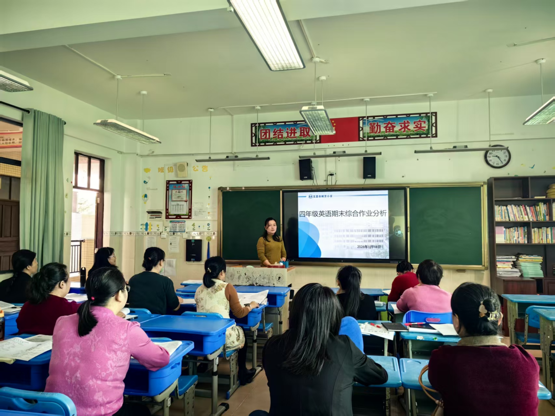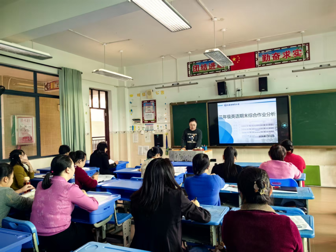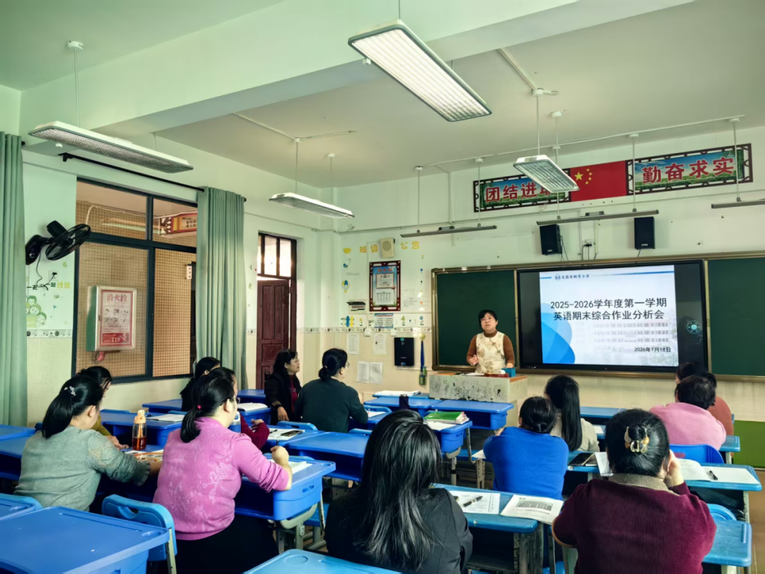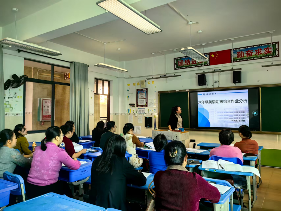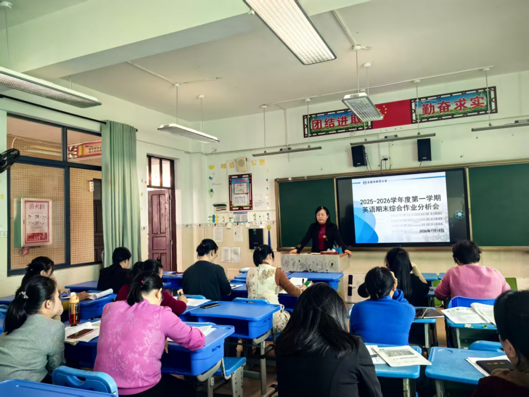 为精准把握2025-2026学年度第一学期我校英语教学成效,找准教学短板,优化教学策略,全面提升英语教学质量,2026年1月18日上午,文昌市树芳小学召开2025-2026学年度第一学期英语学科期末综合作业质量分析会。学校副校长云春雨、英语组组长符海花、傅启迪及全体英语教师参会,各年级备课组长依次作专题分析,共同为学校英语教学提质增效建言献策。会上,各年级备课组长立足本年级教学实际,结合期末综合作业情况展开深度剖析。
