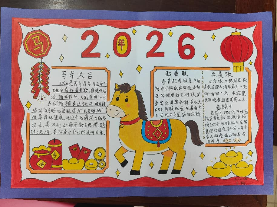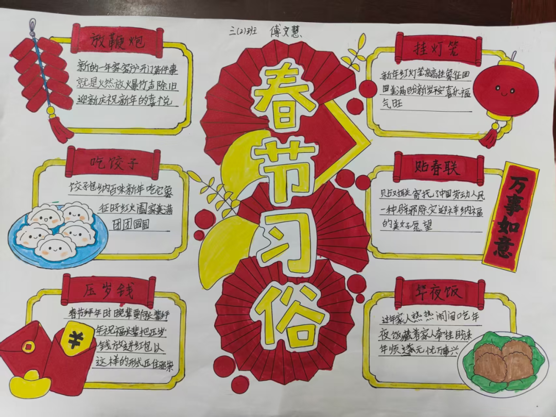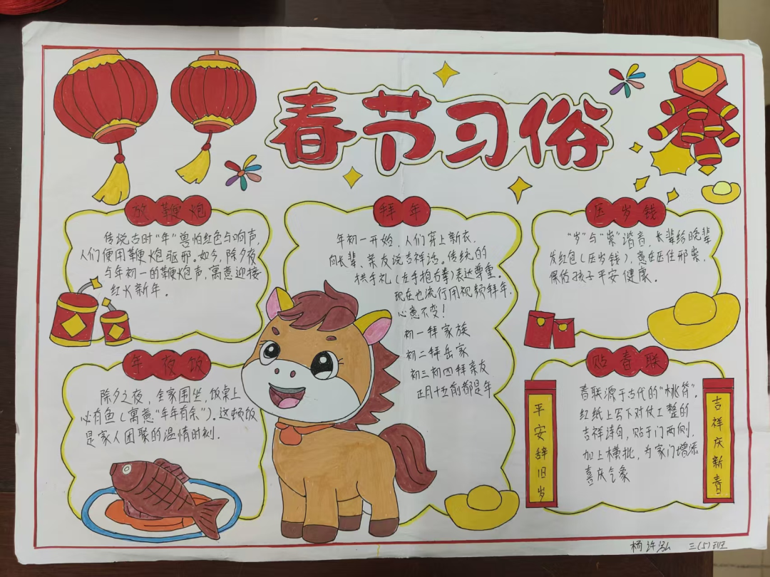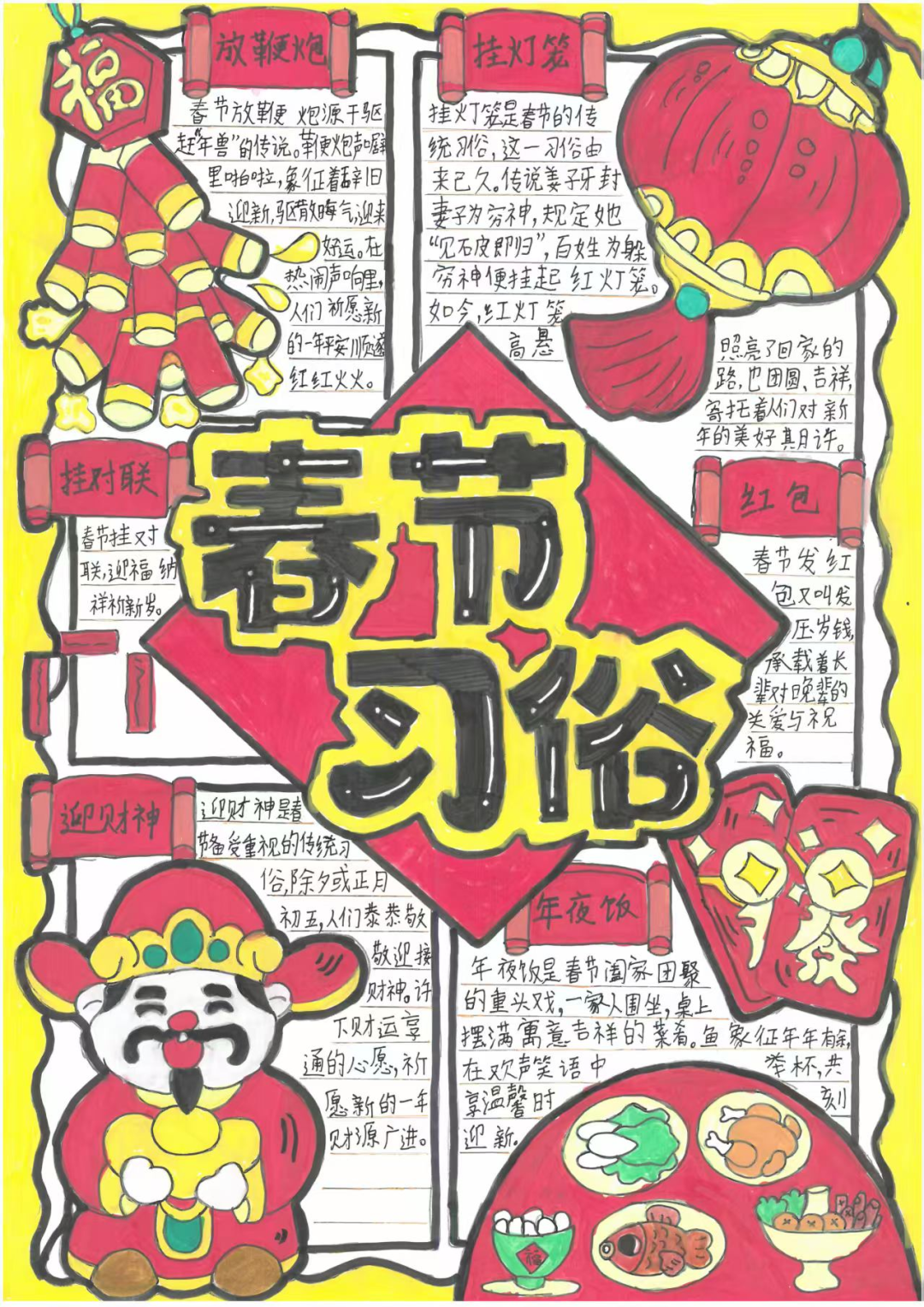 探寻民俗美,传承中华情,寻年俗、品年味、记团圆。孩子们搜集春节、元宵节传统民俗、经典春联与故事,记录家庭温情与年俗体验,制作图文并茂的主题手抄报,生动展现传统节日魅力,让民俗之芳绵延不绝。