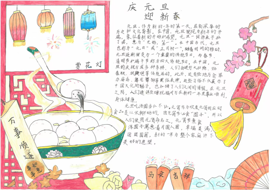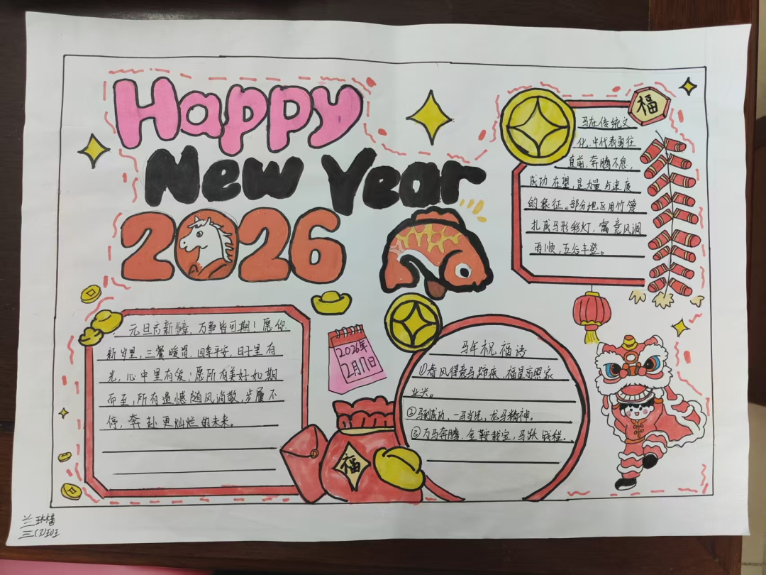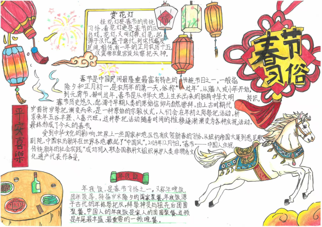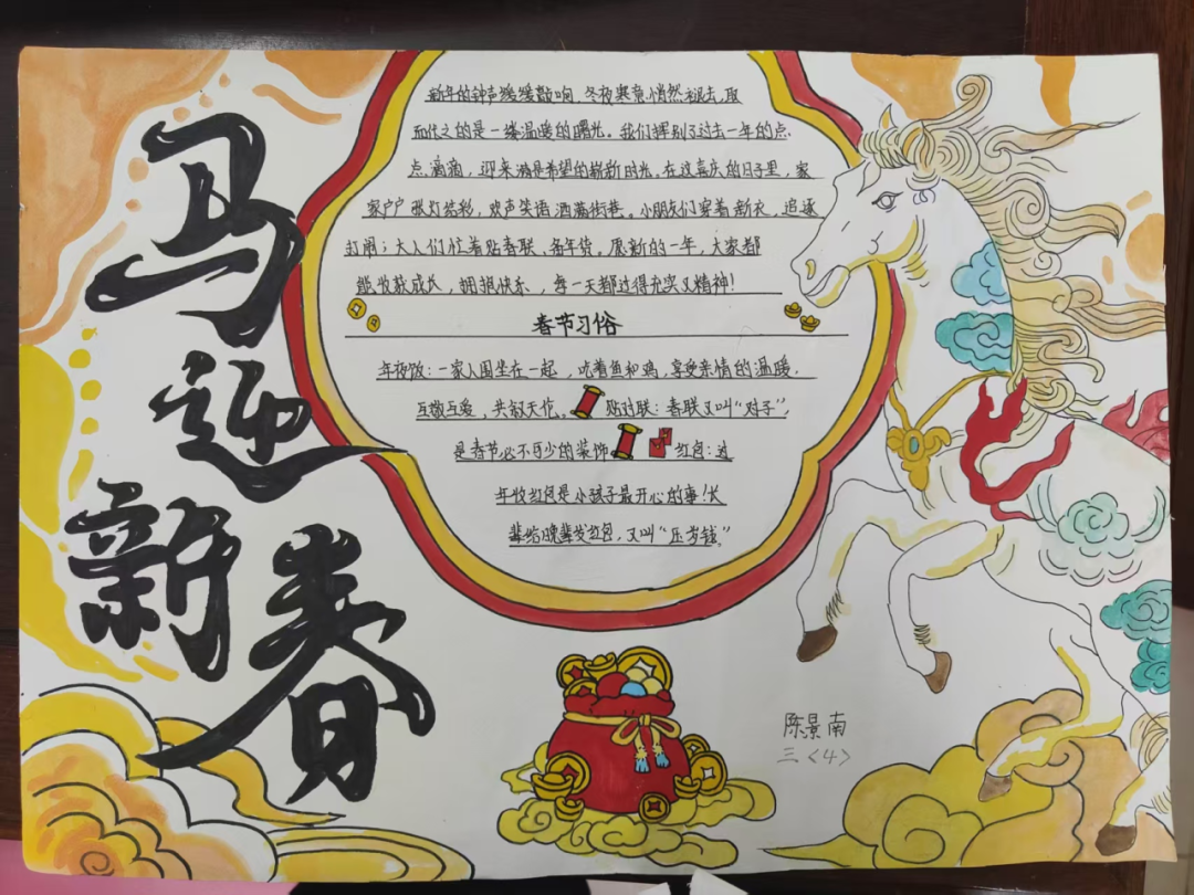 探寻民俗美,传承中华情,寻年俗、品年味、记团圆。孩子们搜集春节、元宵节传统民俗、经典春联与故事,记录家庭温情与年俗体验,制作图文并茂的主题手抄报,生动展现传统节日魅力,让民俗之芳绵延不绝。