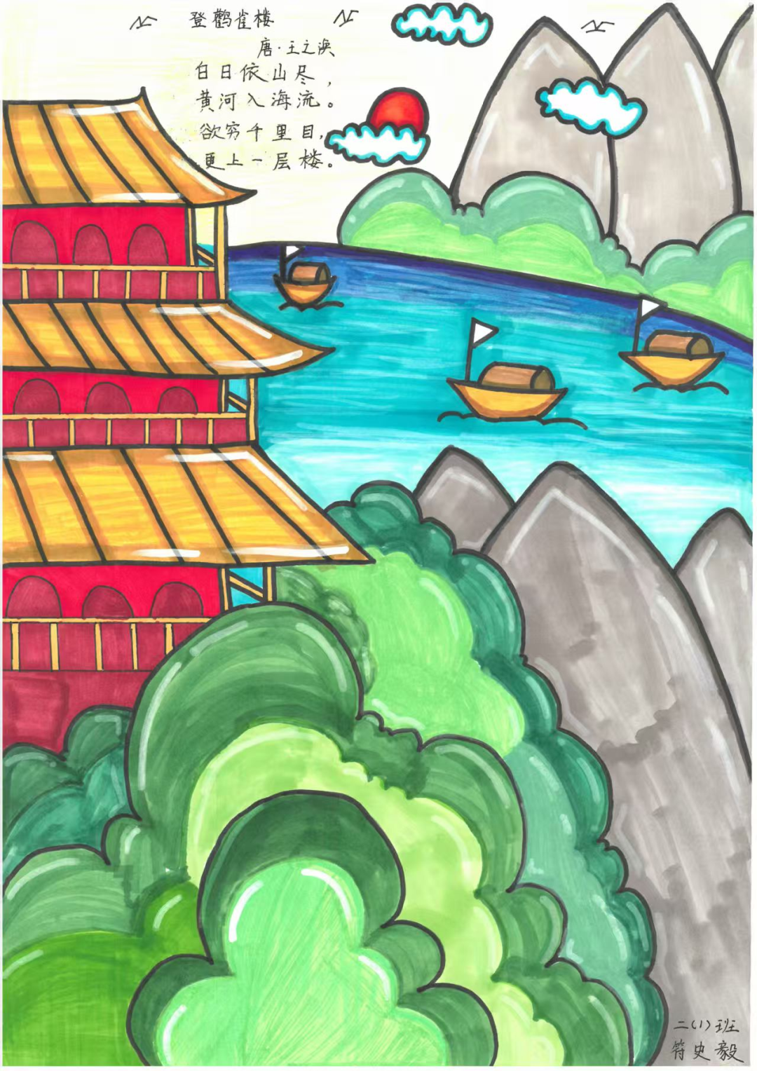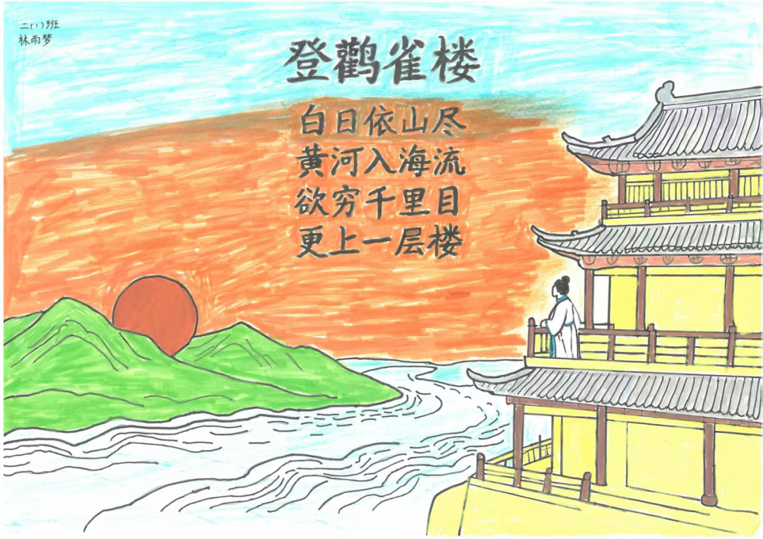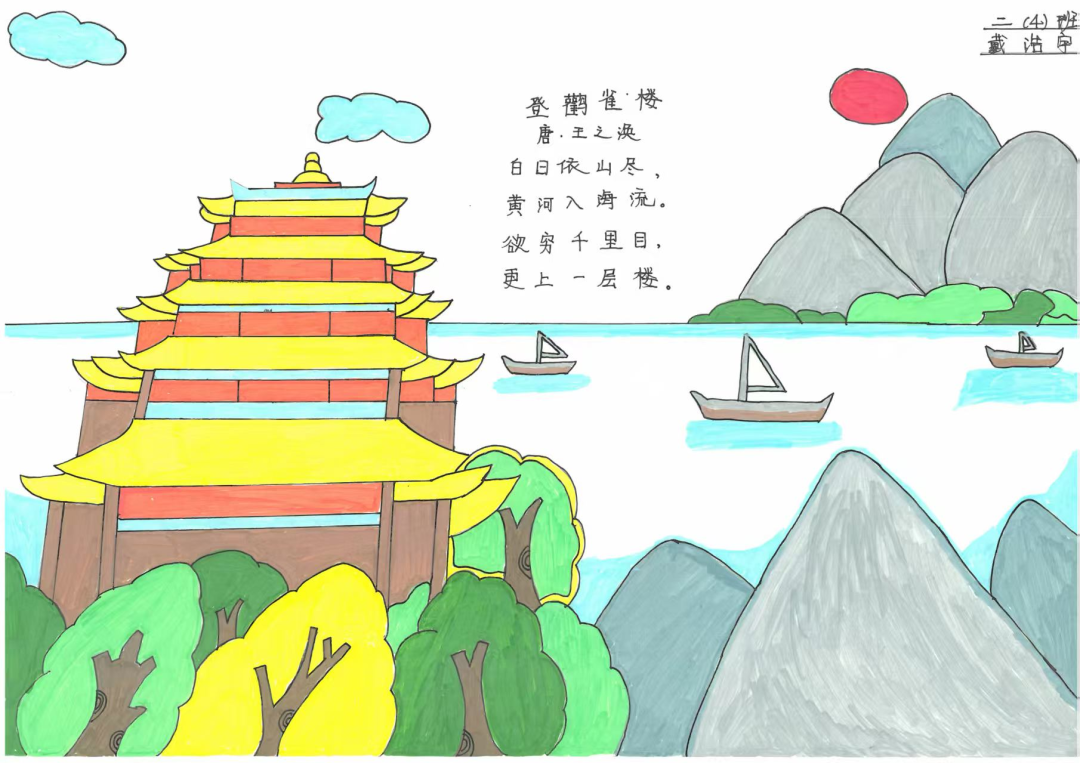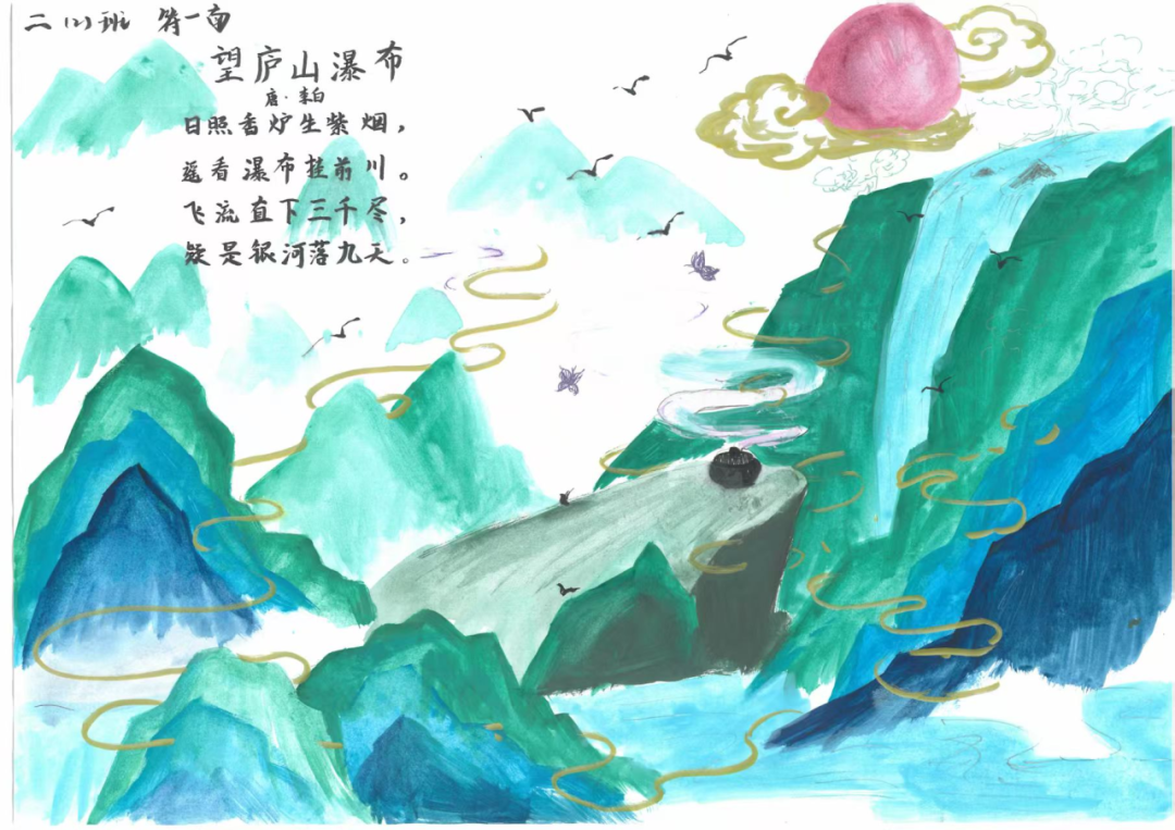 诗中有画,画中有诗,以经典古诗为底色,用色彩描绘诗意。围绕《登鹳雀楼》《望庐山瀑布》等课本古诗,孩子们在A3画纸上图文结合,妙笔生花,让诗词意境跃然纸上,在创作中浸润传统文化。