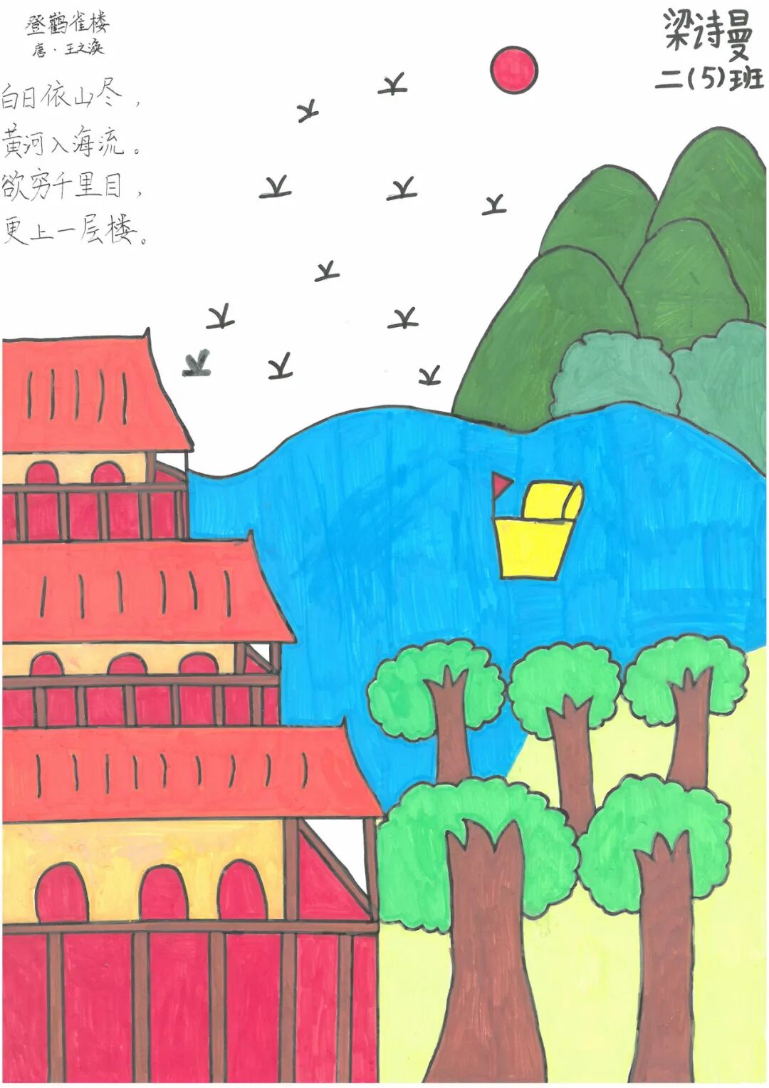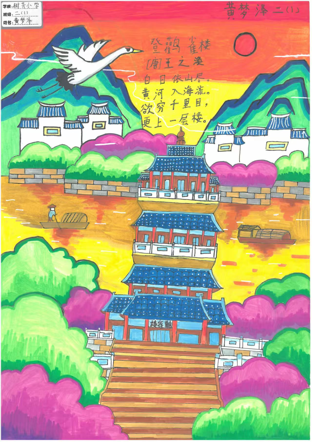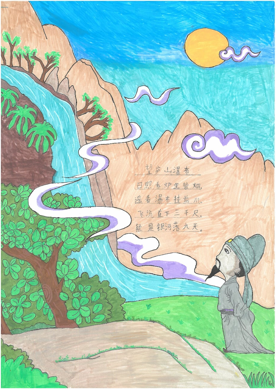 诗中有画,画中有诗,以经典古诗为底色,用色彩描绘诗意。围绕《登鹳雀楼》《望庐山瀑布》等课本古诗,孩子们在A3画纸上图文结合,妙笔生花,让诗词意境跃然纸上,在创作中浸润传统文化。