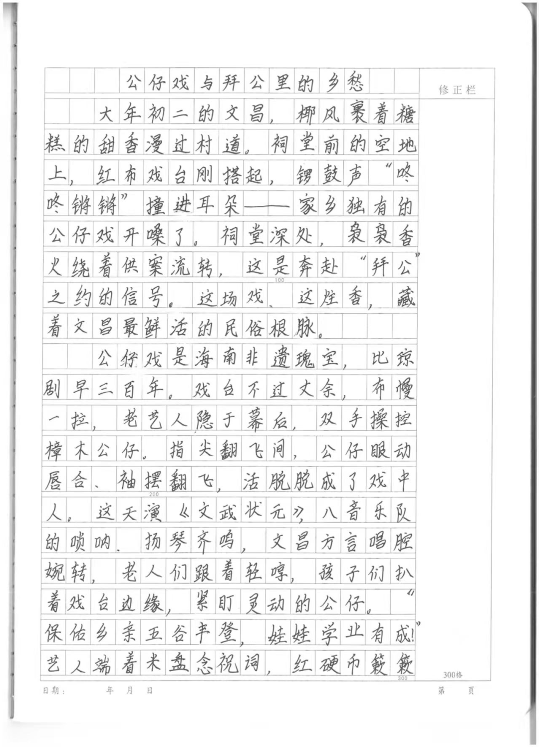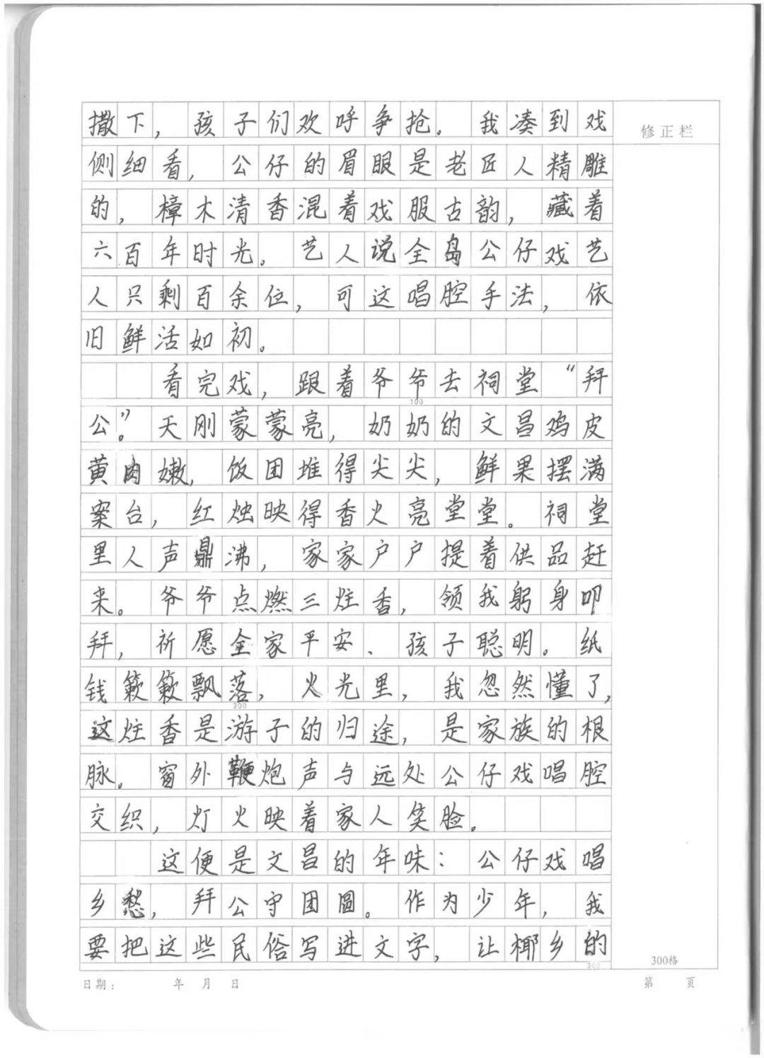 记录乡俗美,留住家乡韵,行走家乡,感知文脉,书写乡情,走进文昌孔庙、椰子大观园探访记录,或是书写文昌公仔戏、拜公等本土民俗,以文字搭配照片,完成有温度的民俗作文,让家乡文化之芳,在笔墨间永久留存。