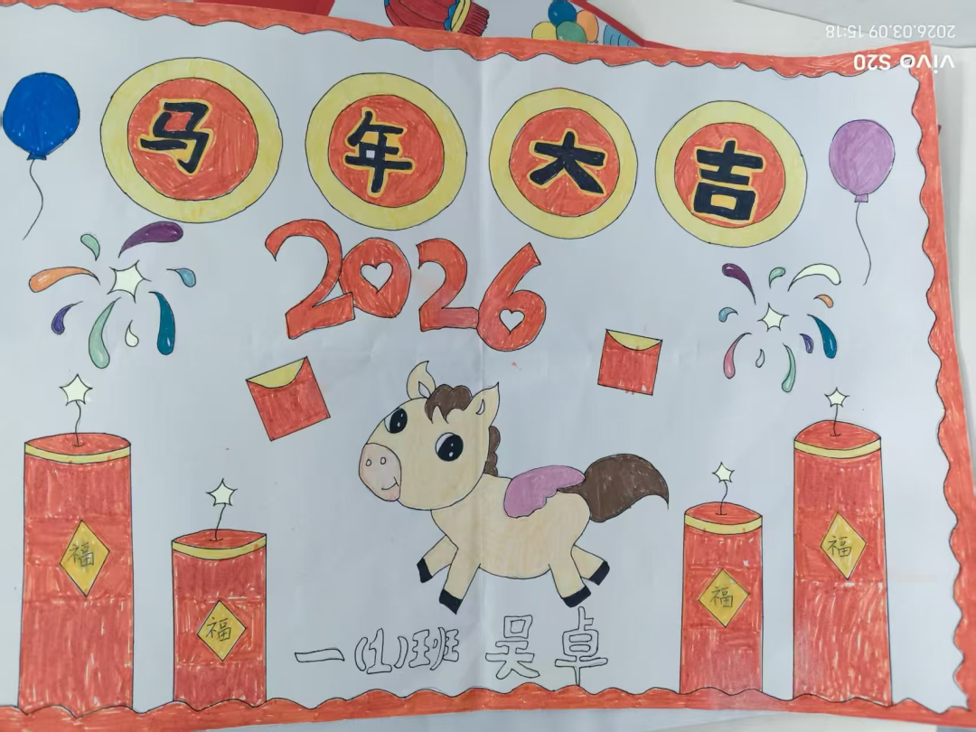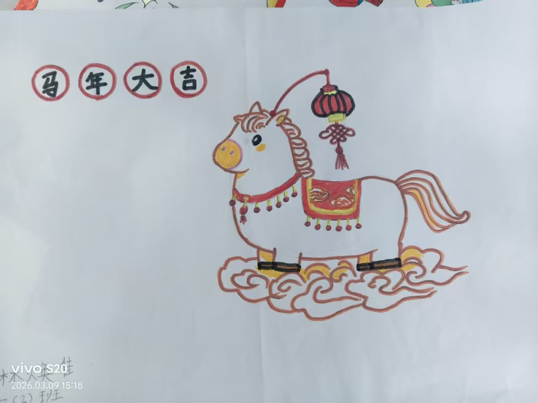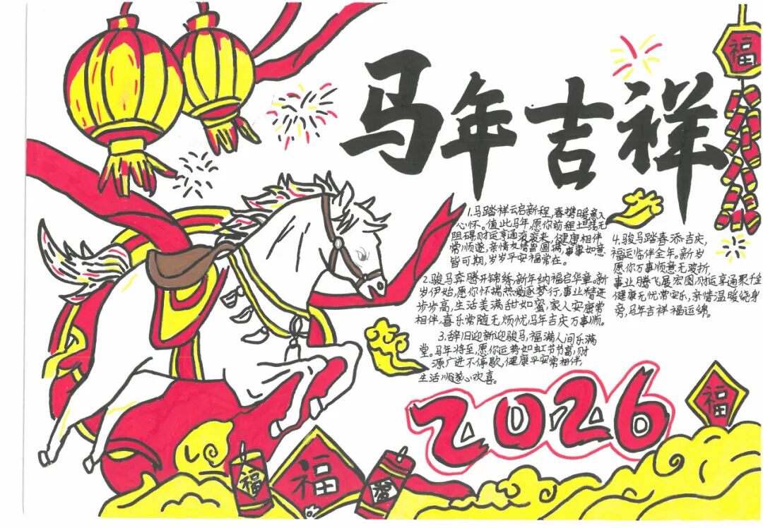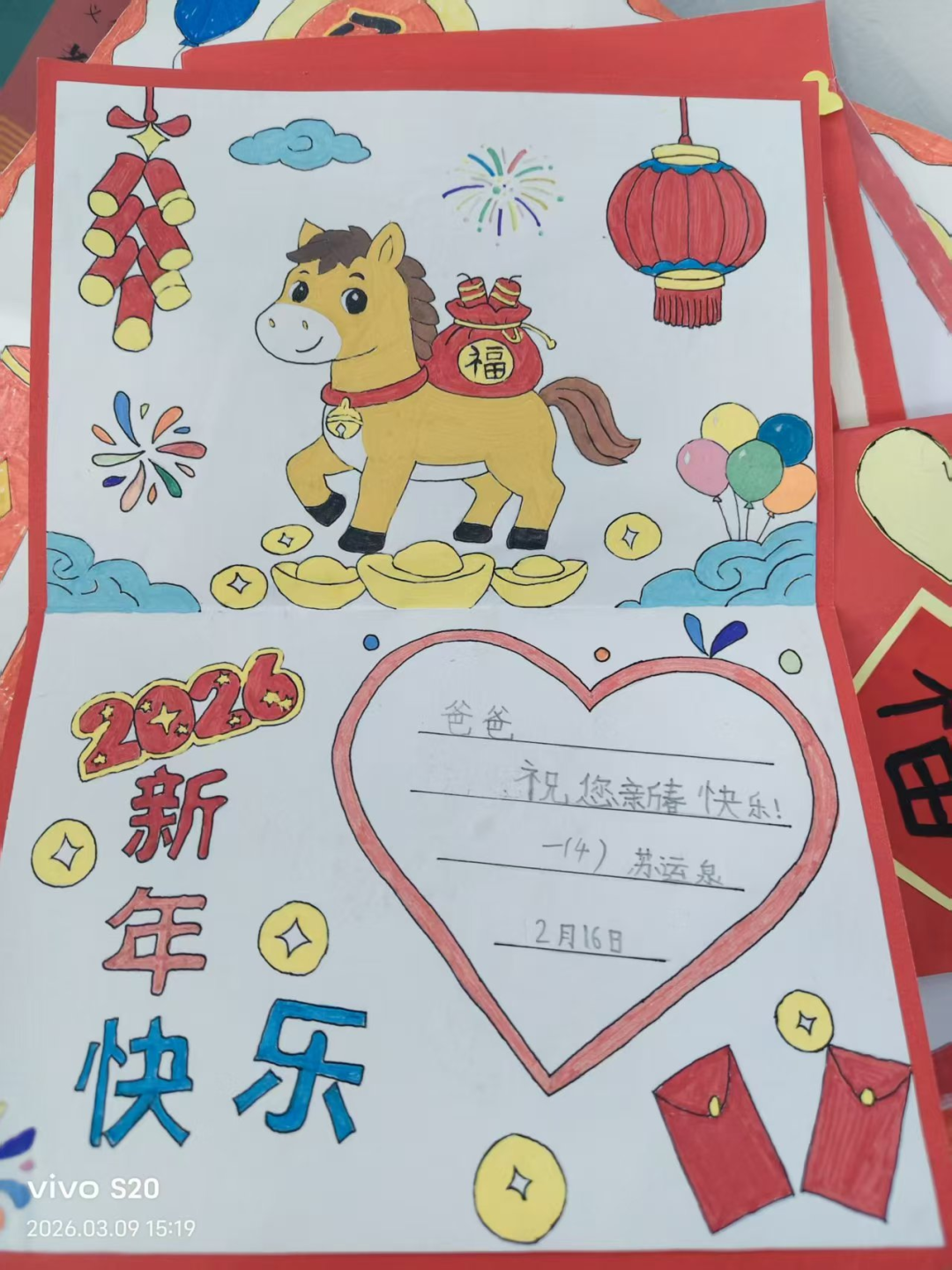 马年送福,童心贺岁,小小画笔绘新春,创意满满迎马年。孩子们将骏马、灯笼、祥云、中国结融入贺卡,用稚嫩的拼音与汉字,写下最真挚的暖心祝福,一张张小卡片,定格马年美好期许,年味十足。