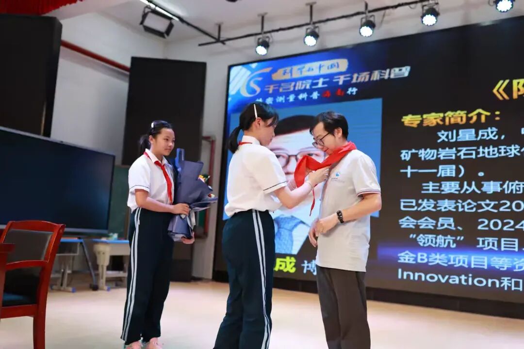 ▲两位少先队员给刘星成教授佩戴红领巾并送上鲜花。