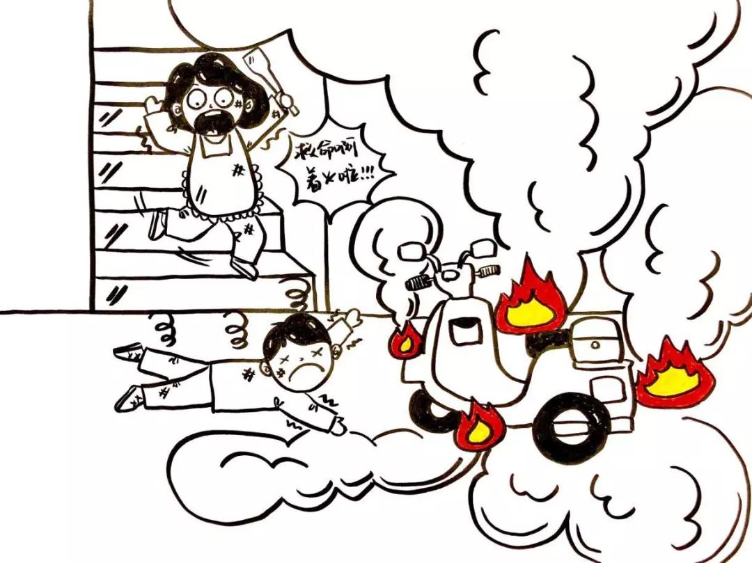 电动自行车停在疏散通道、安全出口、楼梯间、室内等地违规充电极易引起火灾,电动车燃烧产生黑烟,导致楼房内光线不足,严重影响疏散逃生。电动车起火后会产生含有一氧化碳等气体的剧毒浓烟,人体吸入高温剧毒烟气,气管会被灼伤,产生头疼、恶心等症状,然后神志不清,行动不便,进而导致窒息。电动车起火3分钟内,火焰温度可达到1000摄氏度,会导致一整幢四层建筑都充满剧毒浓烟。